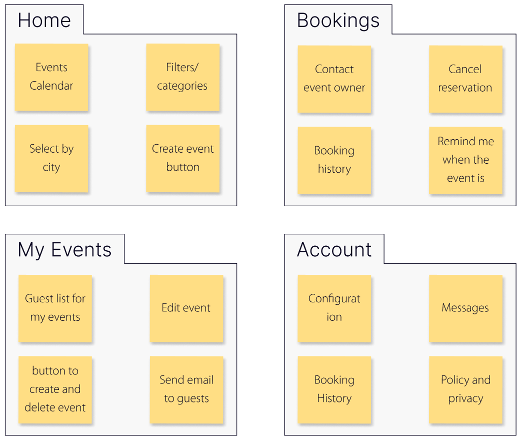 Having as a main goal to design efficiently, I needed to organize all the information that will go into the app, and I felt that the best tool in my context to achieve this was the information architecture, but first we would do well to perform a card sorting to build an efficient and friendly navigation with the user experience. According to the mind maps of our participants these were the results: