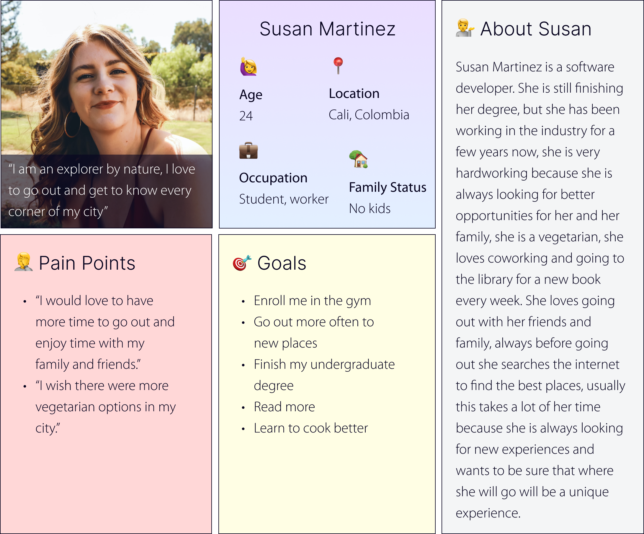 I carried out two ux persona cases to have a broader spectrum of the profiles of the users who will use the app. In general, what I was looking for was to know more in depth who our users will be in order to be able to provide them with an app that gives them a fairly complete solution to their needs. needs.